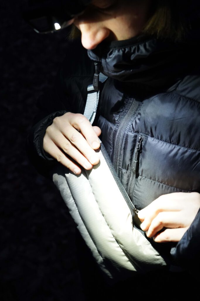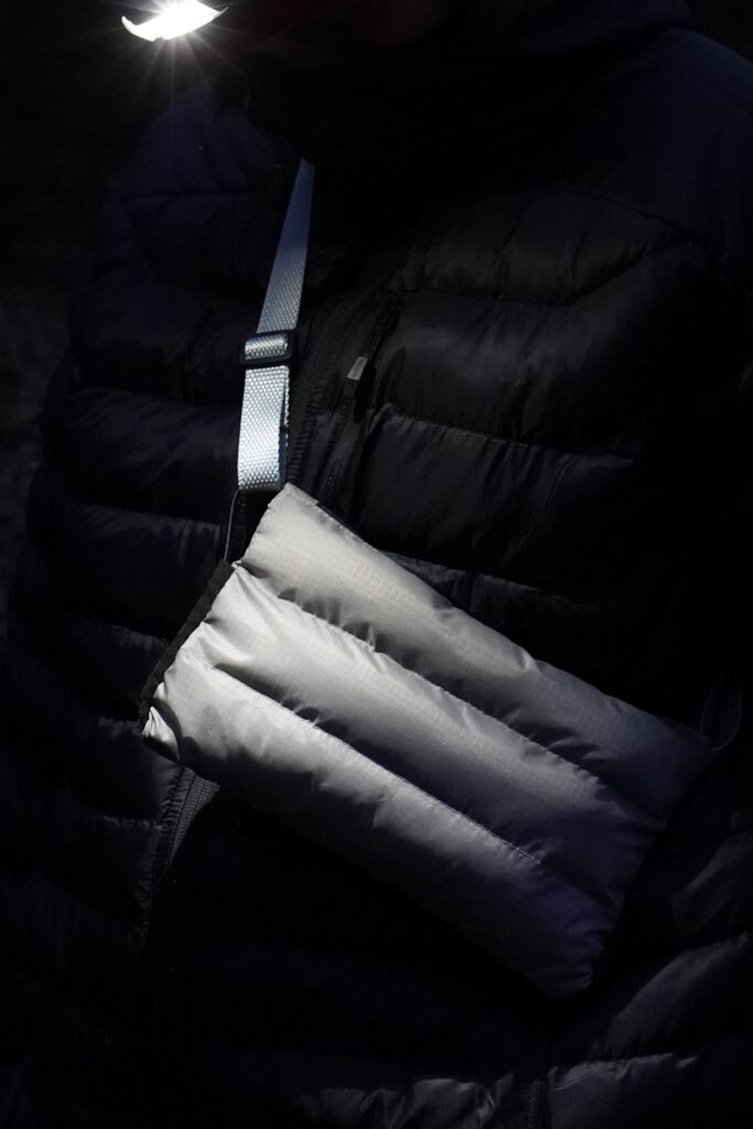 A compact shoulder bag, padded with filling, which protects various objects from mechanical damage or keeps your electronics e.g. your cell phone warm inside on cold days: the air trapped in the filling delays the flow of heat to the outside, so that the warmth stays in the bag longer.